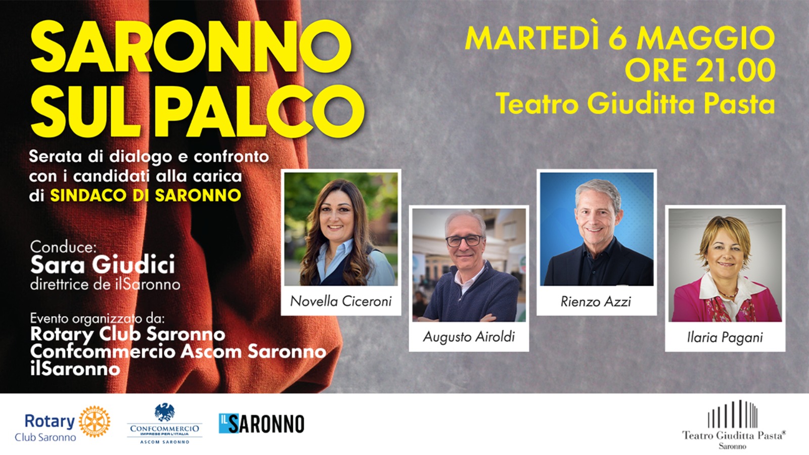 Martedì 6 maggio alle ore 21:00, al Teatro Giuditta Pasta, i protagonisti delle elezioni saliranno sul palco per “Saronno sul palco”, l’iniziativa promossa dal Rotary Club Saronno e da Confcommercio Ascom Saronno, in collaborazione con ilSaronno.